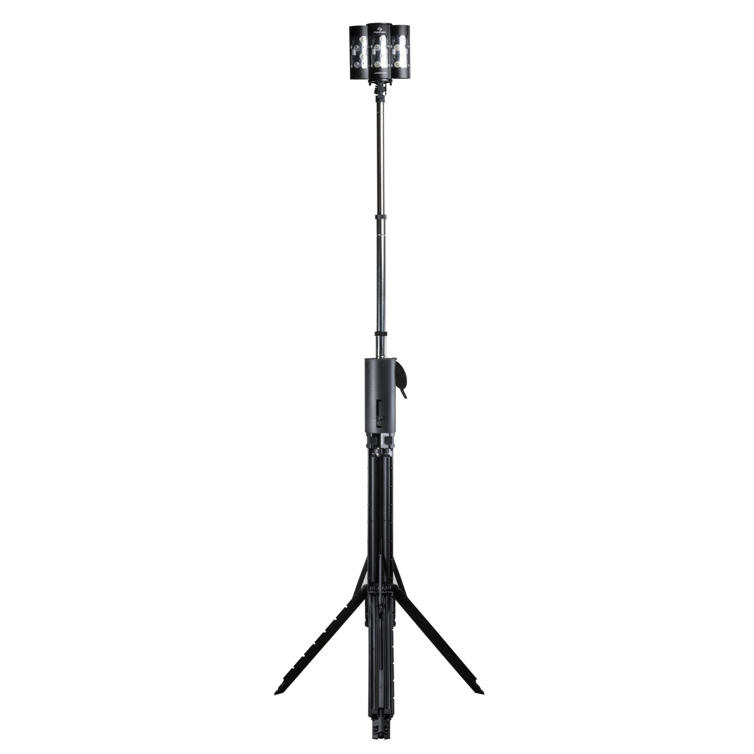The FoxFury Nomad® 360 is a self-contained portable scene light. It’s compact, easy to transport, and needs no cords or generators. This makes it easy to move and permissible to use indoors, outdoors or even submerged underwater. Powered by an internal rechargeable Li-ion battery system, the 360 provides between 3-24 hours of run time. If you have the AC/DC Adaptor (included) plugged in, the Nomad® 360 provides continuous light. 4 modes, including a low, medium, high and flashing setting, enable the user to adjust light intensity and function according to the situation. The Nomad® 360 can be set up in seconds by deploying its built-in tripod legs, raising the telescoping light pole, and tilting the light head. The light head extends tall enough to clear people’s heads, which minimizes shadows and accidental blinding. The light head can swivel, adjust up and down and change from a unidirectional to multi-directional orientation.